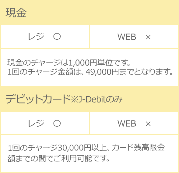 ※majicaにチャージできる上限額は100万円となります。 ※アピタ・ピアゴ店舗ではデビットカードでのチャージは行っていません。 ※驚安堂全店、日本国外の店舗ではレジのチャージができません。